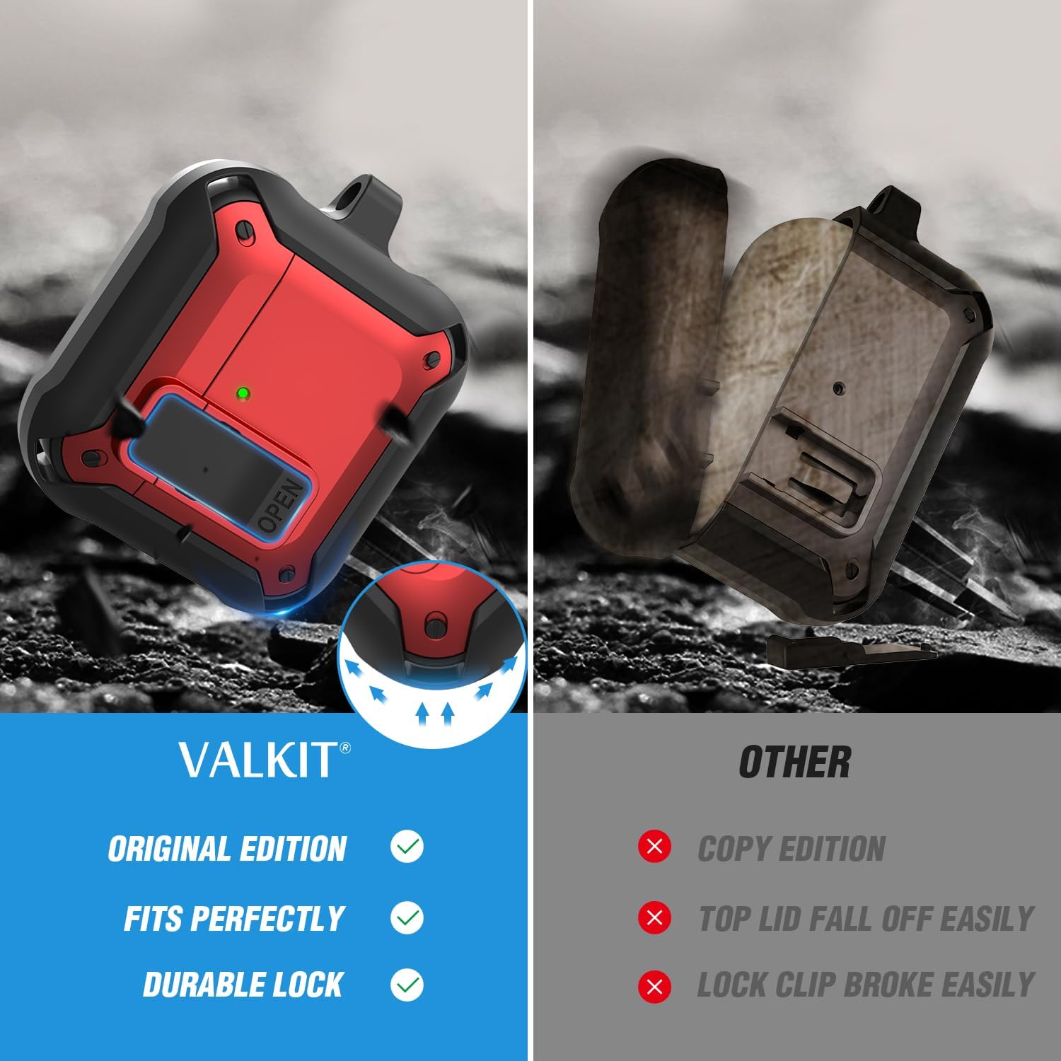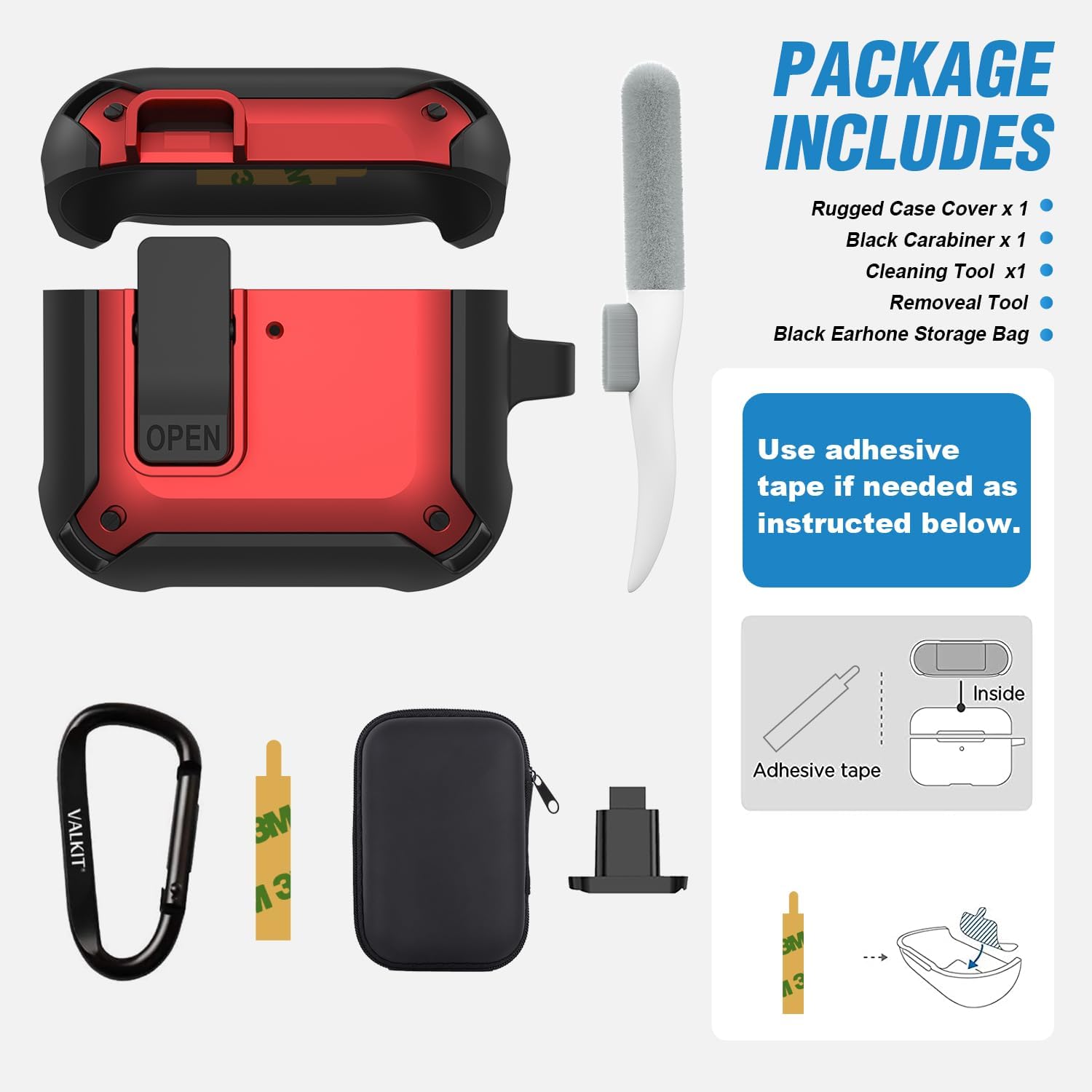 Valkit Armor Series Full-Body Shockproof Protective Case Cover for AirPods 4 Generation Charging Case with Carabiner Keychain, Cleaner Kit, and Accessory Pouch for Men Women- Black Red