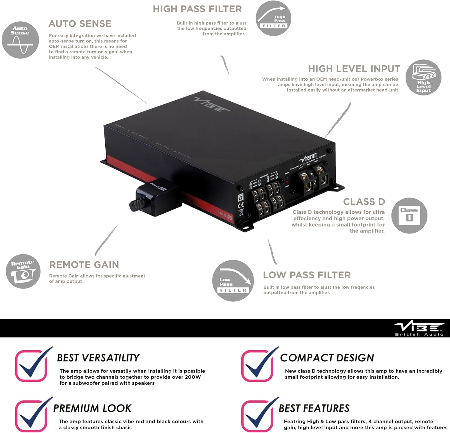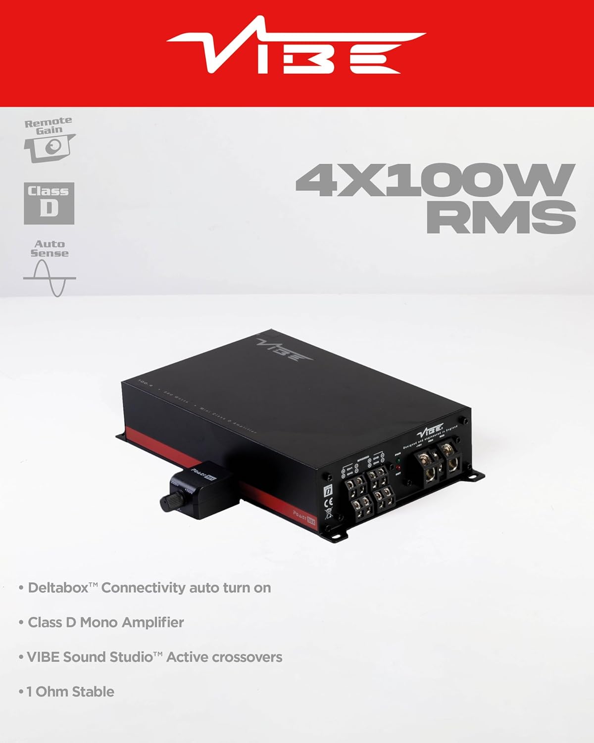 Vibe by Proscenium PB100.4M-V0 Amplifier for Car Audio: 4-Channel Mini Class D Amplifier, High-Level Inputs and AutoSense for Easy OEM Integration