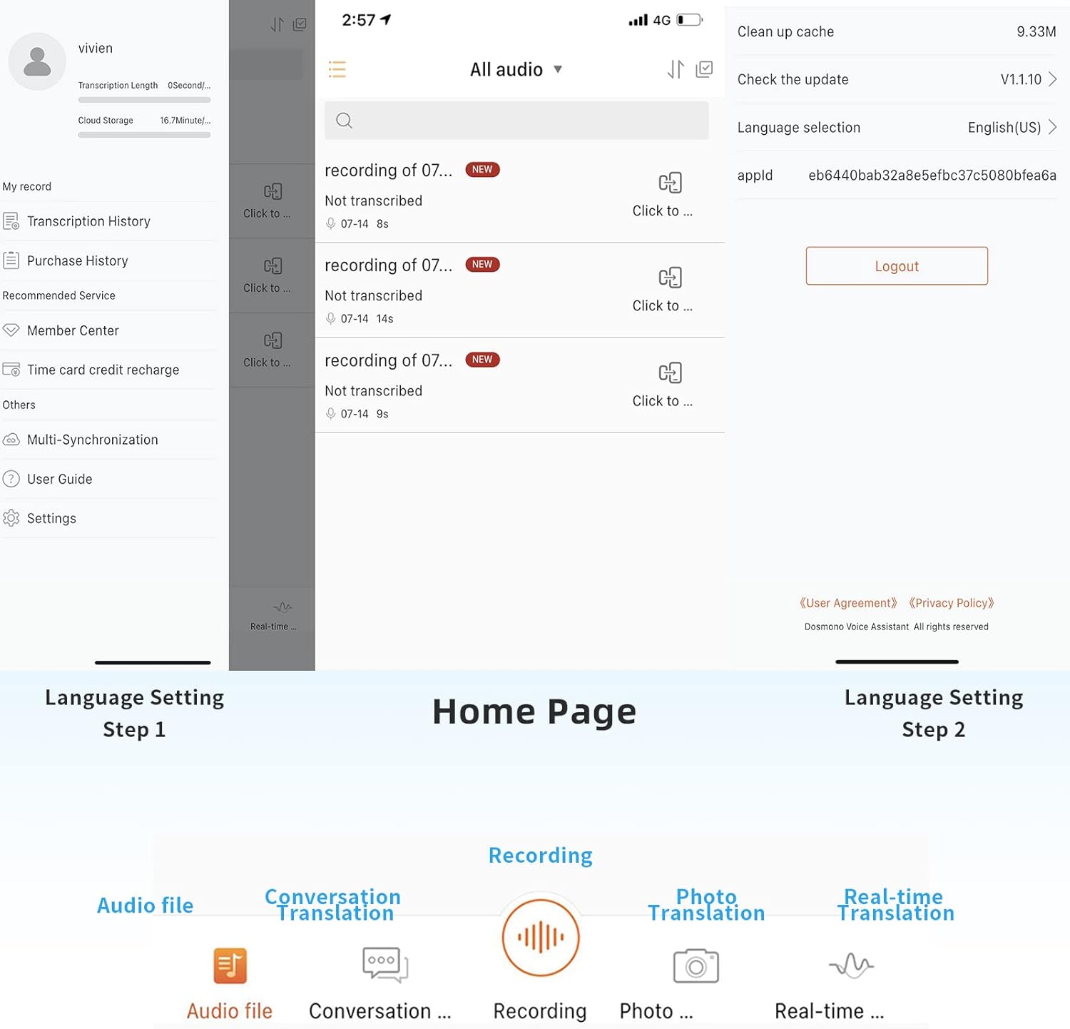 Translation Function: DOSMONO digital voice recorders support 112 language mutual online translation, simultaneous interpretation, 55 languages photo translation on the APP, suitable for meetings, interviews, business negociation and traveling.