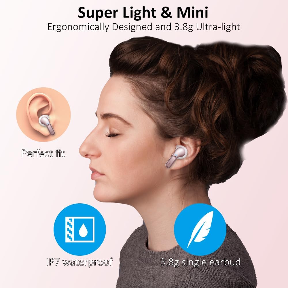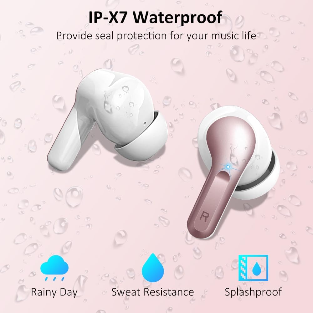 Wireless Earbud Bluetooth 5.3 Headphones, Hi-Fi Stereo Ear Buds with 4 ENC Cancelling Mics, 40H in-Ear Earphones IP7 Waterproof Sports, LED Display, Mini Headset for Laptop Pad TV Phones, Rose Gold